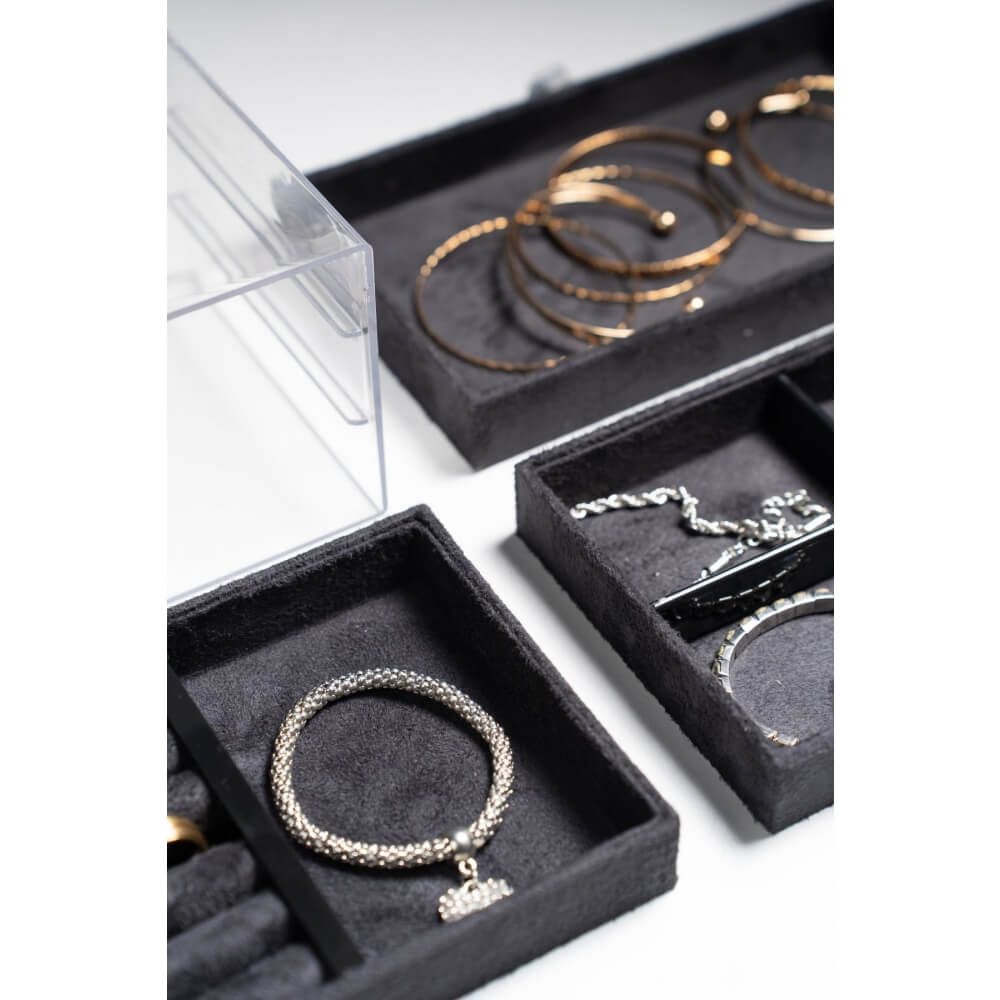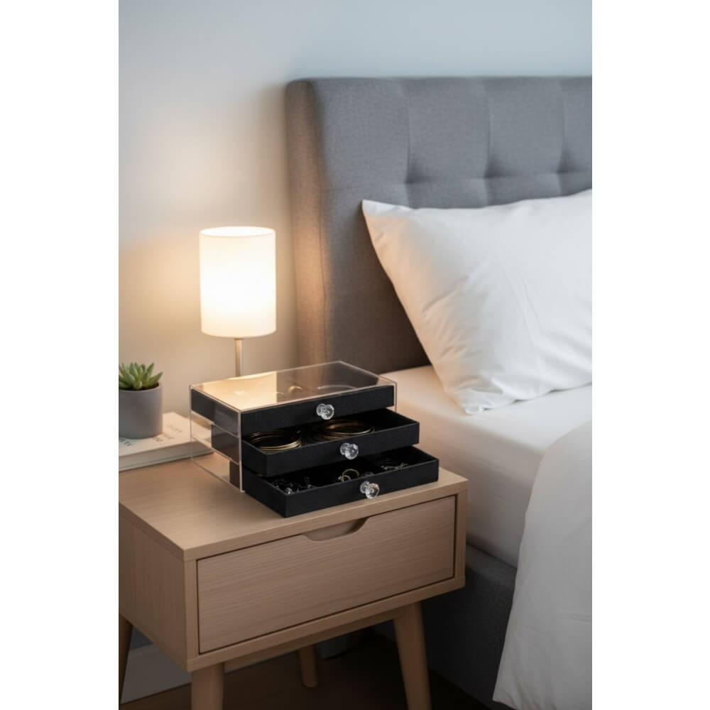 Takılarınız, kozmetik ürünleriniz ve kişisel aksesuarlarınız artık dağınıklığa son veriyor. Siyah rengiyle modern ve zarif bir görünüm sunan bu organizer, evinizin veya ofisinizin dekoruna uyum sağlar.