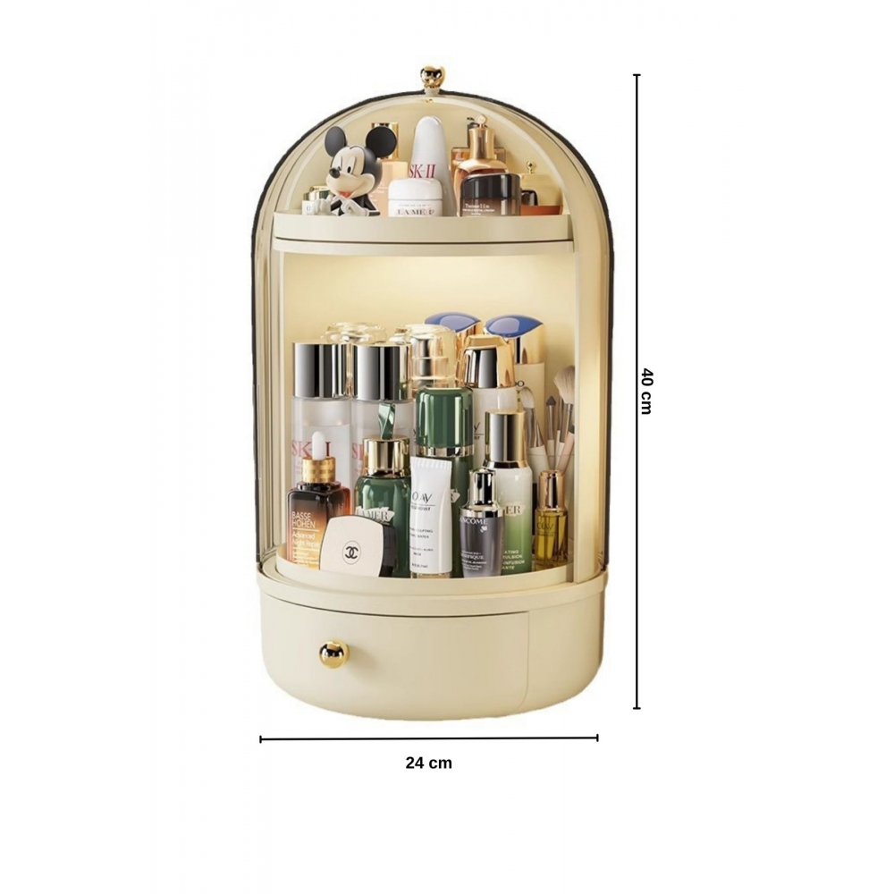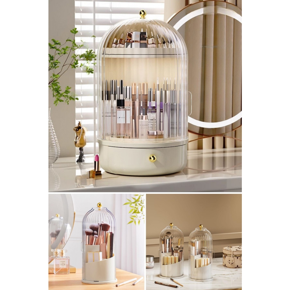 bir adet Glow Vitrin 360 Döner Standlı Çekmeceli Raflı Hazneli Makyaj Kozmetik Organizer.