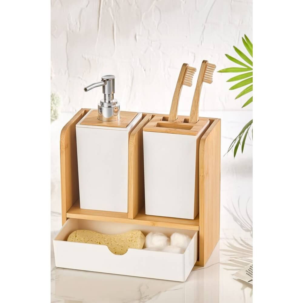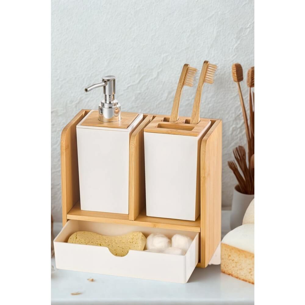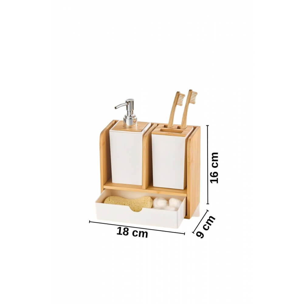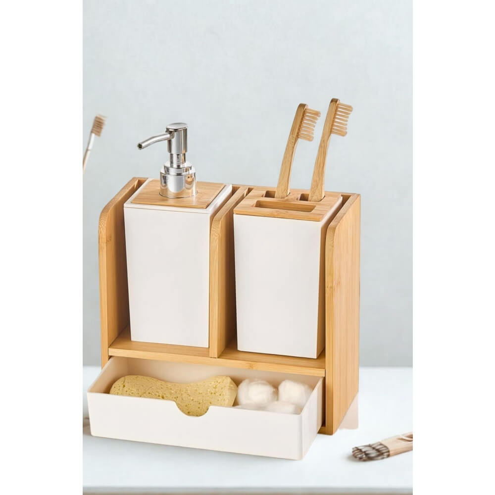 Piev Standlı Çekmeceli Bambu Sabunluk Diş Fırçalık